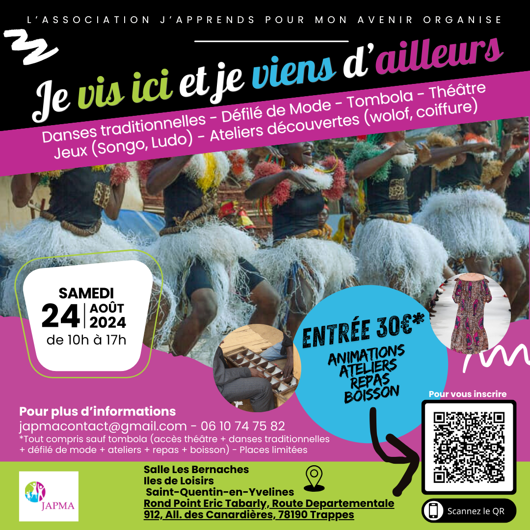 Pour son tout premier événement associatif sur l'Ile de France, "J'Apprends Pour Mon Avenir" vous invite à venir vous immerger dans un univers culturel hors du commun le samedi 24 aout 2024, de 10h à 17h, à la salle Les Bernaches de l'Ile des Loisirs de Saint-Quentin-en-Yvelines !